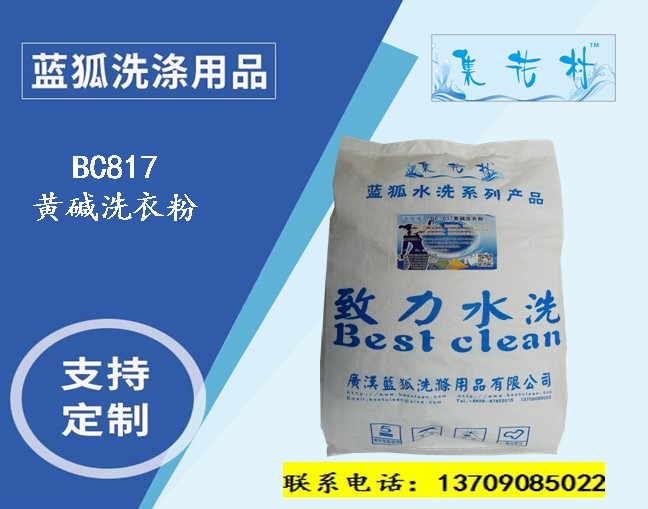藍(lán)狐洗滌用品系列—BC817黃堿洗衣粉,性質(zhì)溫和,泡沫適中,去污力強(qiáng),使用家用和工業(yè)場(chǎng)合的棉麻,絲毛等衣物的洗滌
